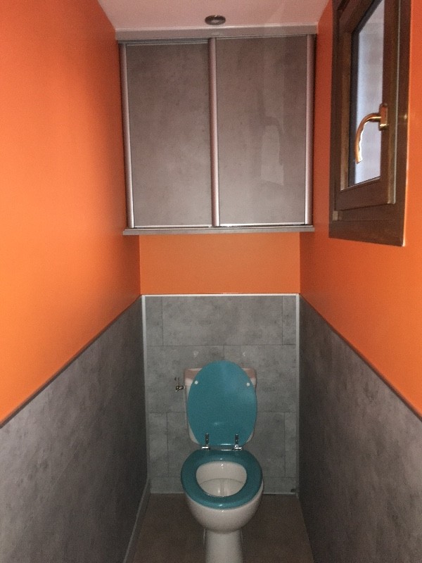 Réalisation par HAINAUT SERVICES DECO à Escautpont d'une armoire sur mesure, partie supérieure toile de verre lisse + peinture, partie inférieure dalle pvc finition aluminium